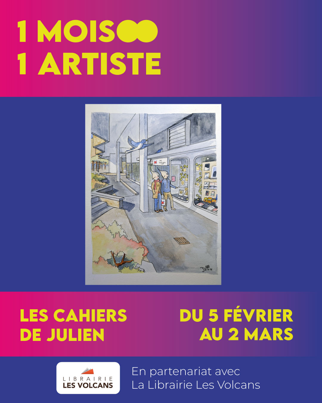 La vitrine de la Librairie Les Volcans à Clermont-Ferrand se pare de poésie. Du 5 février au 31 mars, découvrez l'univers délicat de Julien Wendehenne, une exposition présentée en partenariat avec Appuy Culture.