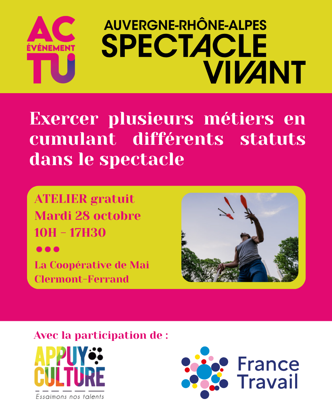 #spectaclevivant #statuts #intermittence #pluriactivité #emploi #formation #APPUYCULTURE #AURASpectacleVivant #FRANCETRAVAIL #ClermontFerrand #CoopérativeDeMai