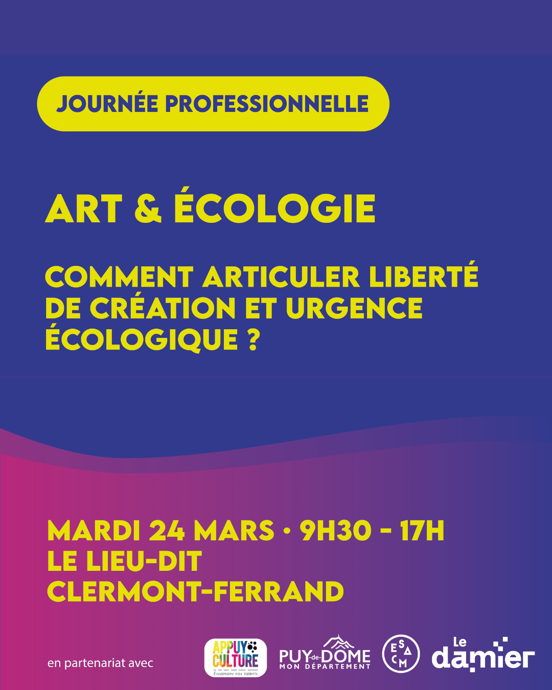 Appuy Culture, en partenariat avec le Département du Puy-De-Dôme, l'École Supérieure d’Art de Clermont Métropole et le Damier, vous propose une journée d'échange et de réflexion sur l'art et l'écologie.